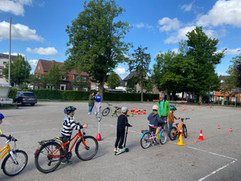 In jedem Schuljahr nehmen alle Klassen an einem Radfahr-Praxistraining auf dem Schulhof teil, das seit einigen Jahren schon vom ADAC unterstützt wird. Übungen sind zum Beispiel langsam fahren, punktgenau bremsen, Hütchen im Slalom umfahren, umschauen, usw.