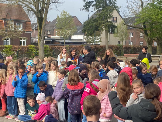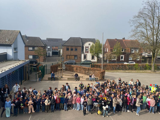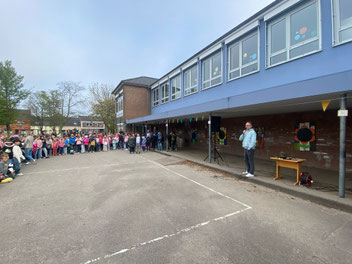 Am letzten Schultag vor den Osterferien trafen wir uns auf dem Außenschulhof, um uns wie immer singend in die Ferien zu verabschieden.