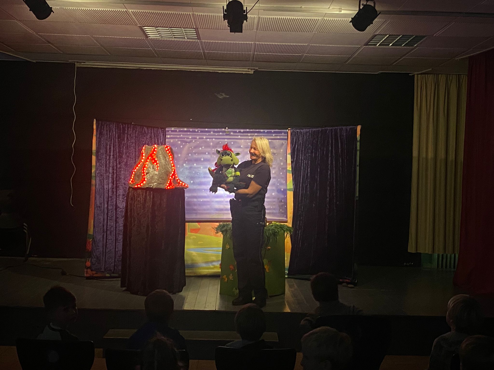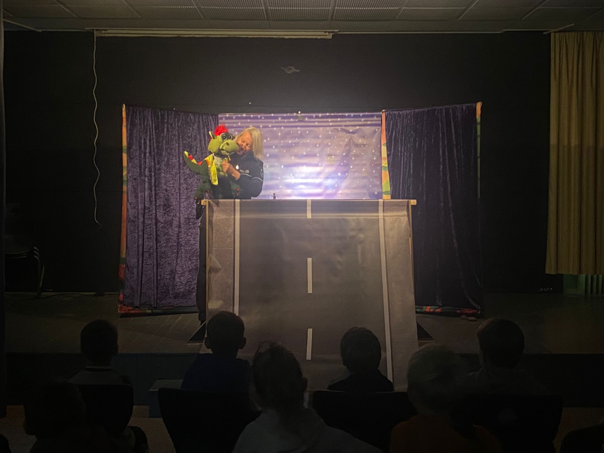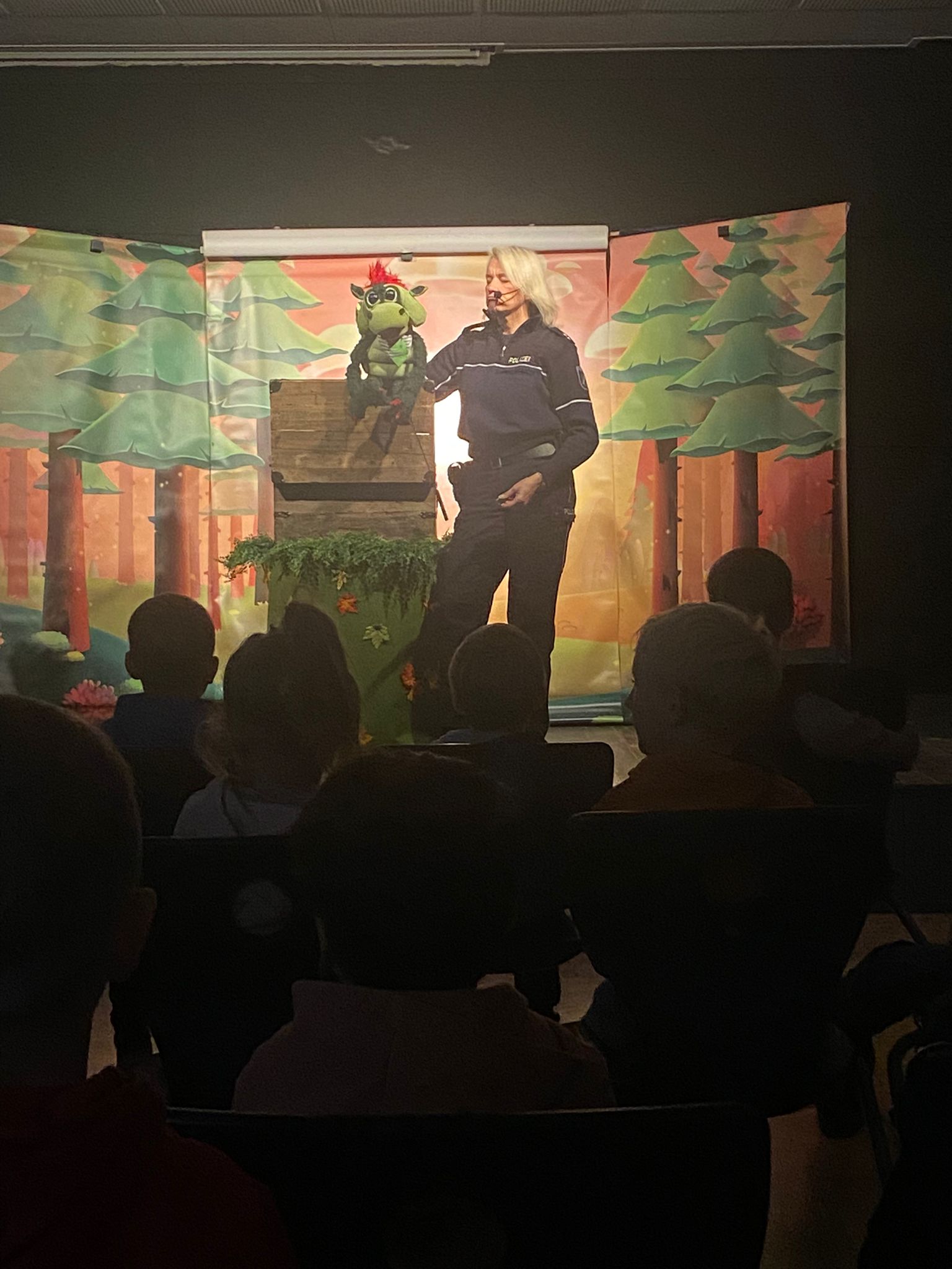 An verschiedenen Terminen fanden sich die Klassen 1 in der Aula ein. In einem kurzen Theaterstück mit "Feo Drachenkralle" lernten die Kinder viel über die Sicherheit im Straßenverkehr.